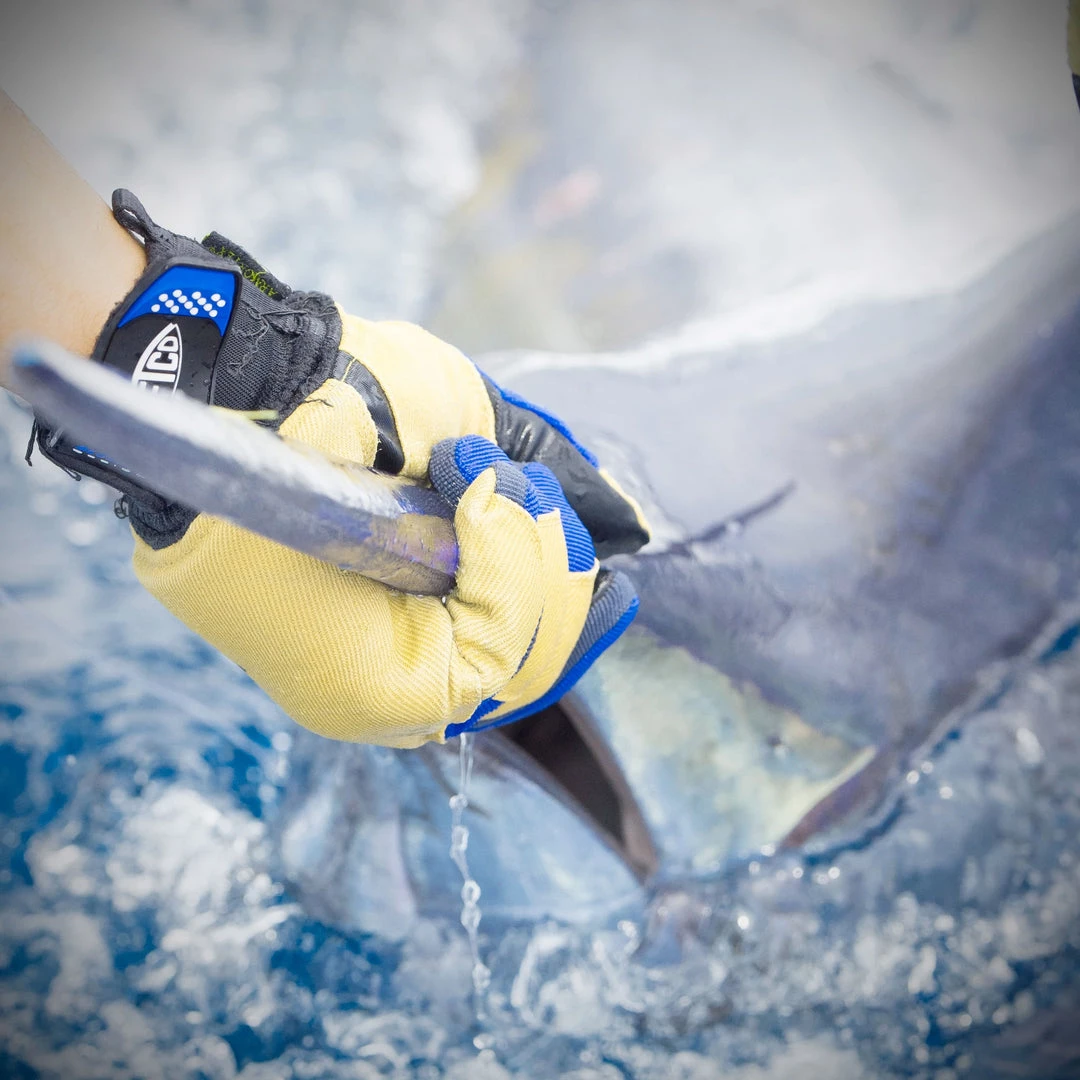 AFTCO Wire Max fishing gloves were designed using the expertise of Capt. Peter B. Wright, world famous big game skipper, author, and IGFA Hall of Fame member. This is the ultimate saltwater fishing glove for leadering big fish. Closed cell EVA foam covered with super tough Armortex® wraps hand and lines palm, fingers and thumb to maximize protection when handling mono, wire or cable leaders. Durable Tacky-Grip palm and Spandura® forchettes improves dexterity, while foam-backed mesh keeps fingers cool and protected. Wrap-around neoprene strap with Velcro® closure over woven cuff assures a secure fit and repels leader snags.