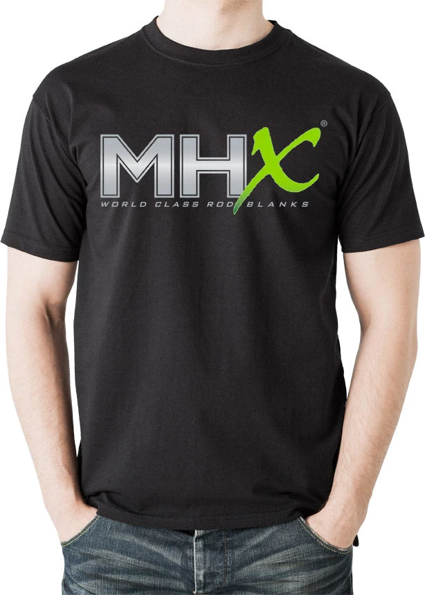 Stylish MHX ‘World Class Rod Blanks” t-shirt with oversize logo on chest. Hanes 100% cotton BEEFY-T crew neck t-shirt, black.