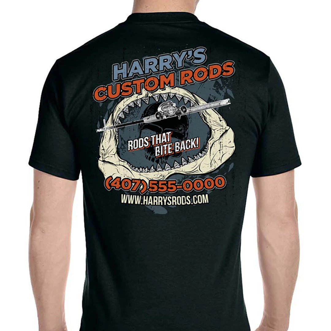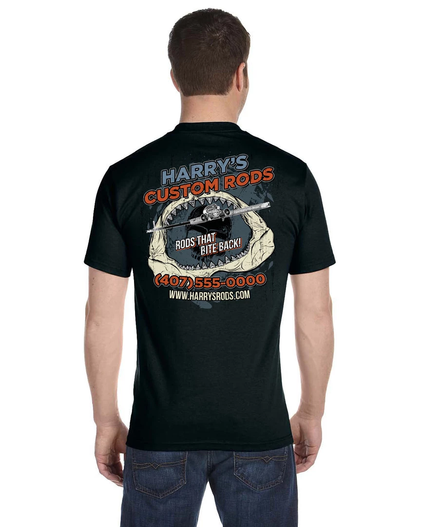 Note: Front graphics are printed over the left breast. The main artwork prints on the back side.