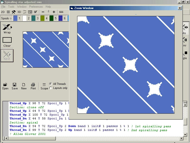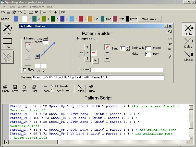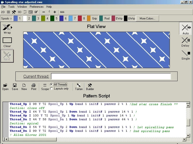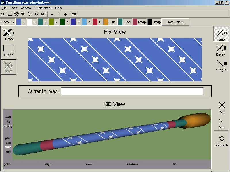 You can use VisualWRAP as a pattern viewer, showing you how existing patterns are formed, thread-by-thread, on the screen. Once you see how patterns develop it makes it easier to understand the sequence in which to lay down threads on your rod. If you are keen can also try editing existing patterns, or coming up with your own using VisualWRAP’s in-built scripting language and script builder.